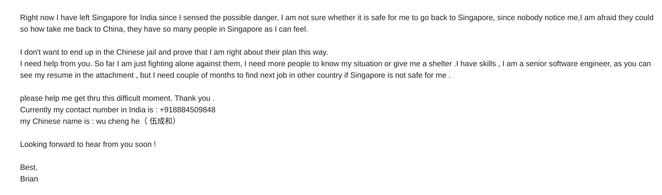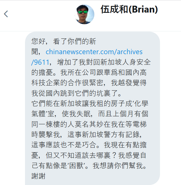 您好,看了你们的新闻,https://22.chinanewscenter.com/archives/9611 ,增加了我对回新加坡人身安全的担忧。我所在公司跟华为和国内高科技企业的合作很紧密,我越发觉得我从国内跳到它们的坑里了。它们能在新加坡让我租的房子成’化学气体’室,使我失眠,而且上个月有个同一栋楼的人莫名其妙在我在等电梯时袭击我,这事新加坡警方有记录,这事应该也不是巧合。我现在有点担忧,但又不知道该去哪里?我感觉自己有点像是‘困兽’。我想请你们帮我。谢谢。