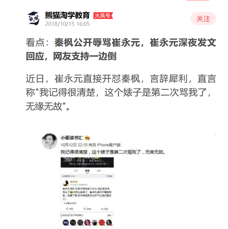 此文一出引起网友、崔粉们也激动万分,评论区爆炸了,都在支持小崔谴责秦岚。好象还骂秦枫是有后台的婊子。