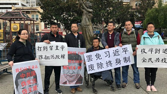 中国全国人大会议在北京开幕之际,旧金山的几位华人,在著名民运人士方政的带领下,来到中国城花园角广场民主女神像前,呼吁全国人大废除国家主席终身制,罢免独裁者习近平。